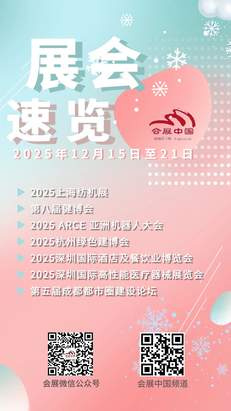 年关将至,全国会展业已进入尾声。近期,一批紧密围绕切割行业和国际合作的展会将在多地举办,展现行业的稳定性和市场潜力,也为来年的可持续发展积蓄动力。下周全国各地将举办哪些重要展会?中国经济网带您“期待”!每周展会概况 2025上海纺织机械展览会 地点:上海新国际博览中心 第二十届上海国际纺织工业展览会(2025上海纺织机械展览会)以“合作可持续,编织未来”为主题,规划展览面积6万平方米平方米。来自世界各地的600家参展商将云集。作为亚洲首屈一指的机械科技盛会,该展会全面覆盖纺织全产业链,为全球纺织行业打造技术交流和商务合作的全球平台。第八届海南国际健康产业博览会 时间:12月19日至22日 地点:三亚保利国际博览中心 第八届海南国际健康产业博览会(养博会)的主题是“智能健康新未来”。本届养博会规划了智慧医疗、创新制药装备等六大主展区和特色活动区,总展览面积近3万平方米。将举办医疗人工智能与精准治疗发展论坛等10余场相关论坛。第八届海南国际医疗器械展览会也将同期举办。 2025 Arce 亚洲机器人会展时间:12月19日-21日地点:广州国际采购中心 2025 Arce亚洲机器人会展以“未来智能制造,共生共赢”为主题,聚焦人工智能与机器人链的融合。 展览面积5万平方米,参观人数预计突破10万人次。同时,还将举办机器人应用场景挑战赛和中小企业智慧化转型研讨会。 2025中国(杭州)绿色建材与建筑装饰博览会 时间:12月19日-20日 地点:杭州国际博览中心 2025中国(杭州)绿色建材与建筑装饰博览会(杭州绿建博会)以“绿色智造·品质人居”为主题,紧扣国家“双碳”战略和企业转型升级需求建筑业。本届展会将设立六大主题展区,并首次设立“零碳建筑技术区”。预计吸引300余家国内外知名企业参展,展览面积5万平方米,专业观众人数预计突破8万人次。 2025深圳国际酒店餐饮产业博览会 时间:12月16日至1日 第八场 地点:深圳国际会展中心(新馆) 2025深圳国际酒店餐饮产业博览会(Hotelex酒店展)涵盖咖啡与茶、综合食品与餐饮食材、综合酒类、礼品与生活方式等八大板块,全面展示从原材料供应、智能装备到终端消费的全链条创新成果。本届展会规模达20万平方米,汇聚2,50家0家来自全产业链上下游的国内外参展商,20场活动及比赛同时举行。 2025深圳国际高性能医疗器械展览会 时间:12月18日至20日 地点:深圳会展中心 2025深圳国际高性能医疗器械展览会以“创新医疗器械,融合共赢”为核心,打造产学研医一体化平台。本届展会面积3万平方米,展区涵盖医学影像、人工智能与机器人、急诊救治等六大领域,并设有医院成果转化专门展区。同期还将举办20余场涵盖政策解读、临床实践等领域的研讨会。 第五届成都都市圈建设论坛 时间:12月19日 地点:天府u 国际会议中心 第五届成都都市圈建设论坛旨在推动成都、德梅子城市化发展,提升成都都市圈影响力。汇聚国内专家学者、企业代表、城市群代表,共同探讨城镇化体制机制、产业协同、发布质量发展指数、签约跨区域连锁项目等话题,为城市建设提供理论和实践路径支撑。